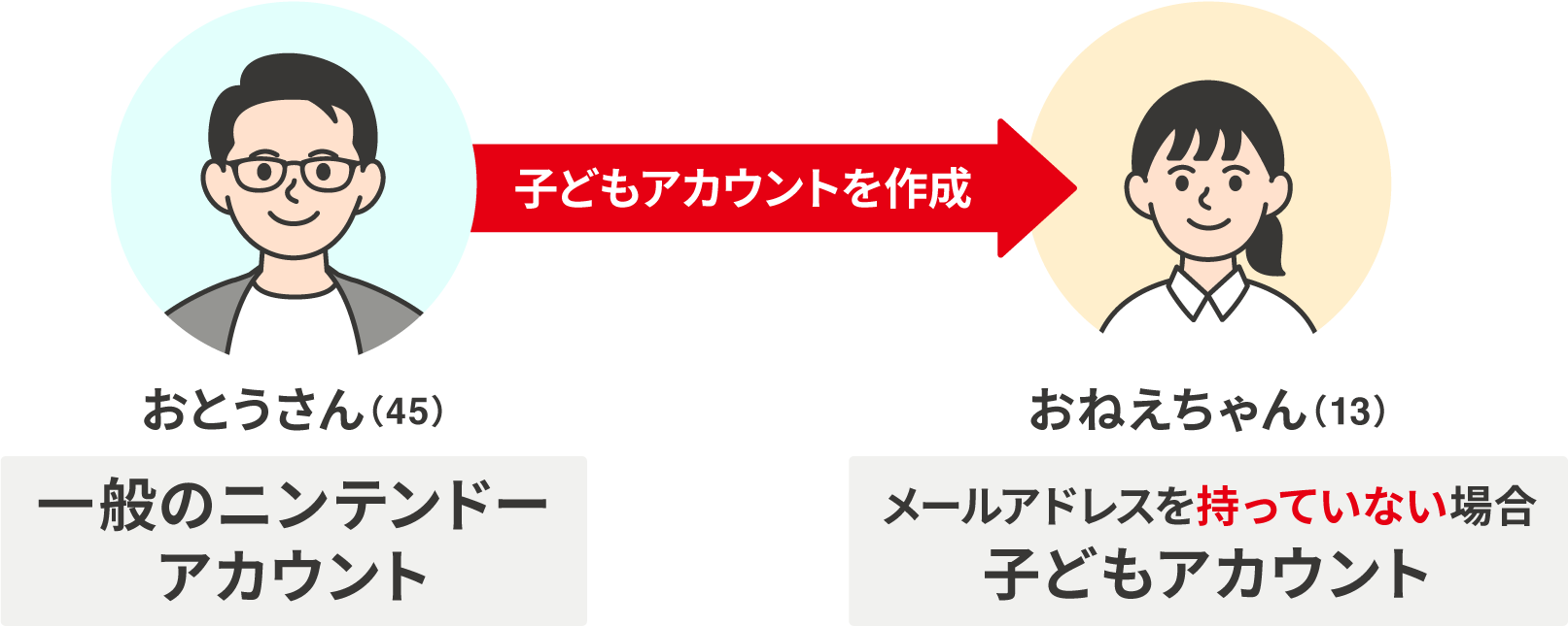 13歳以上でもメールアドレスをお持ちでない場合は、保護者の方(18歳以上)の一般のニンテンドーアカウントを使用して、「子どもアカウント」を作成してください。