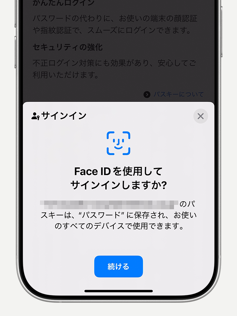 対象ブラウザーで利用可能です。くわしくは「パスキーを設定できる機器」をご確認ください。
