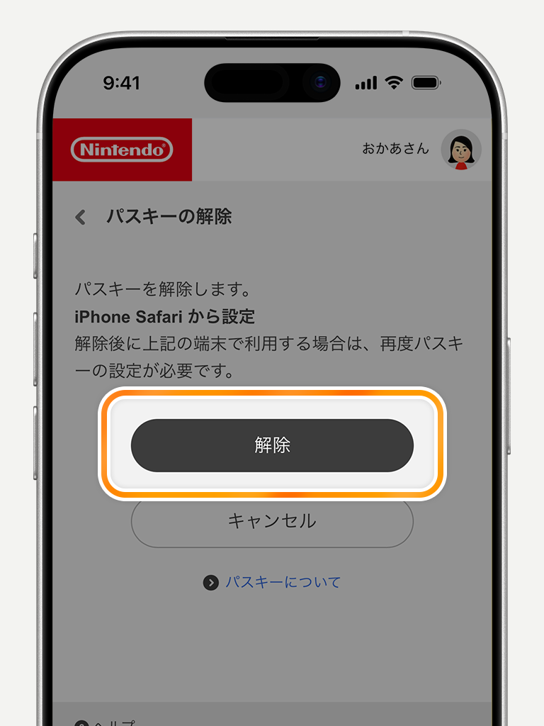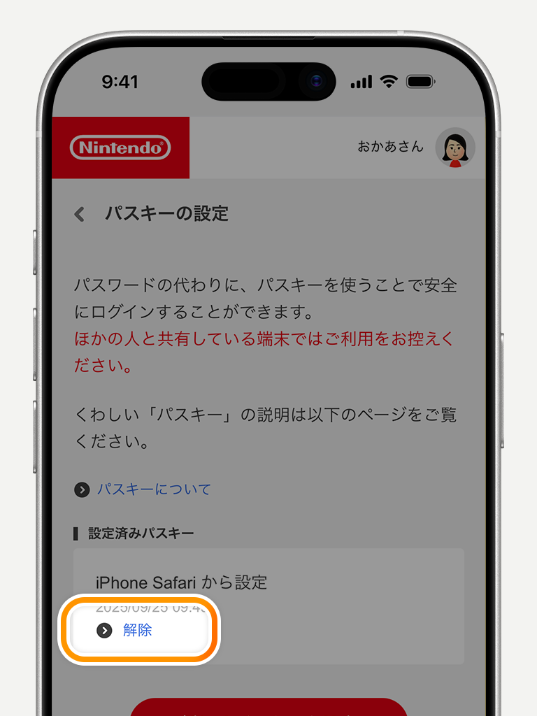 ニンテンドーアカウントのパスキーを解除する必要が出てきた場合は、次の手順で解除してください。