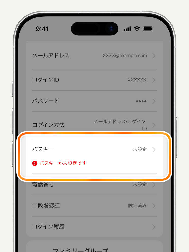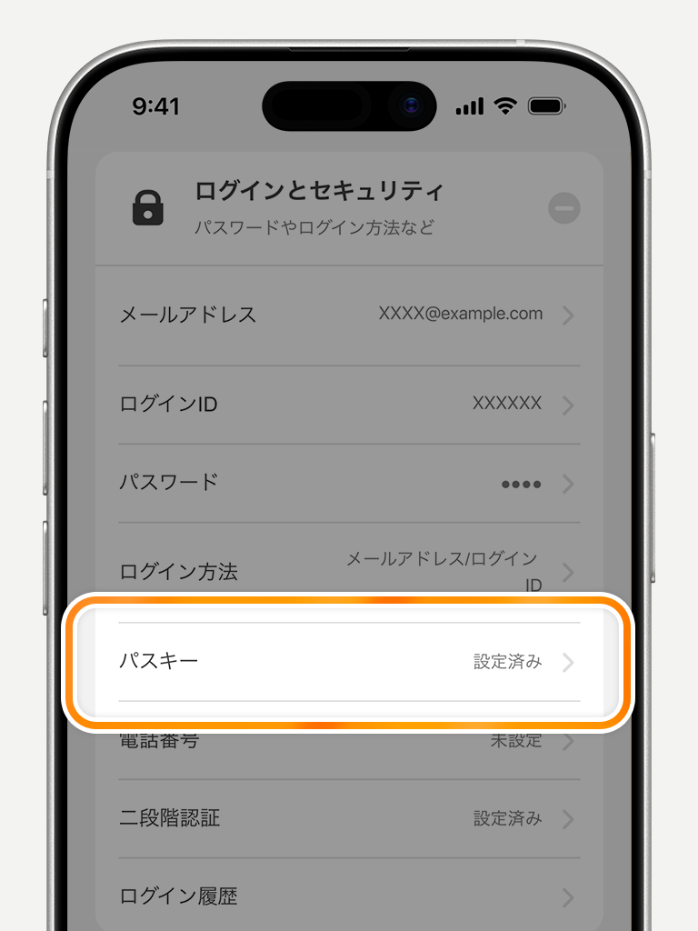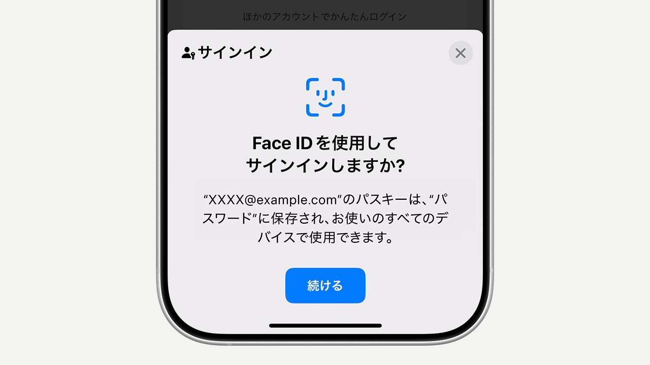 パスキーを設定すると、メールアドレス(またはログインID)とパスワードの入力は不要になりますが、パスキーを設定した機器を機種変更したり、紛失したりした場合に、メールアドレスとパスワードでのログインが必要になることがあります。お忘れにならないよう、十分ご注意ください。